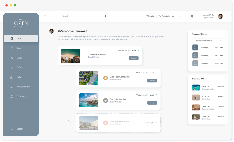 Tasked with upgrading design and brand copy while unifying backend CMS operations, the client sought to streamline efficiency and elevate their online presence. With a focus on simplifying content management and enabling seamless deal and offer creation, THE OZEN COLLECTION aimed to reflect its unparalleled luxury across all digital touchpoints, ensuring a captivating experience for its discerning clientele.